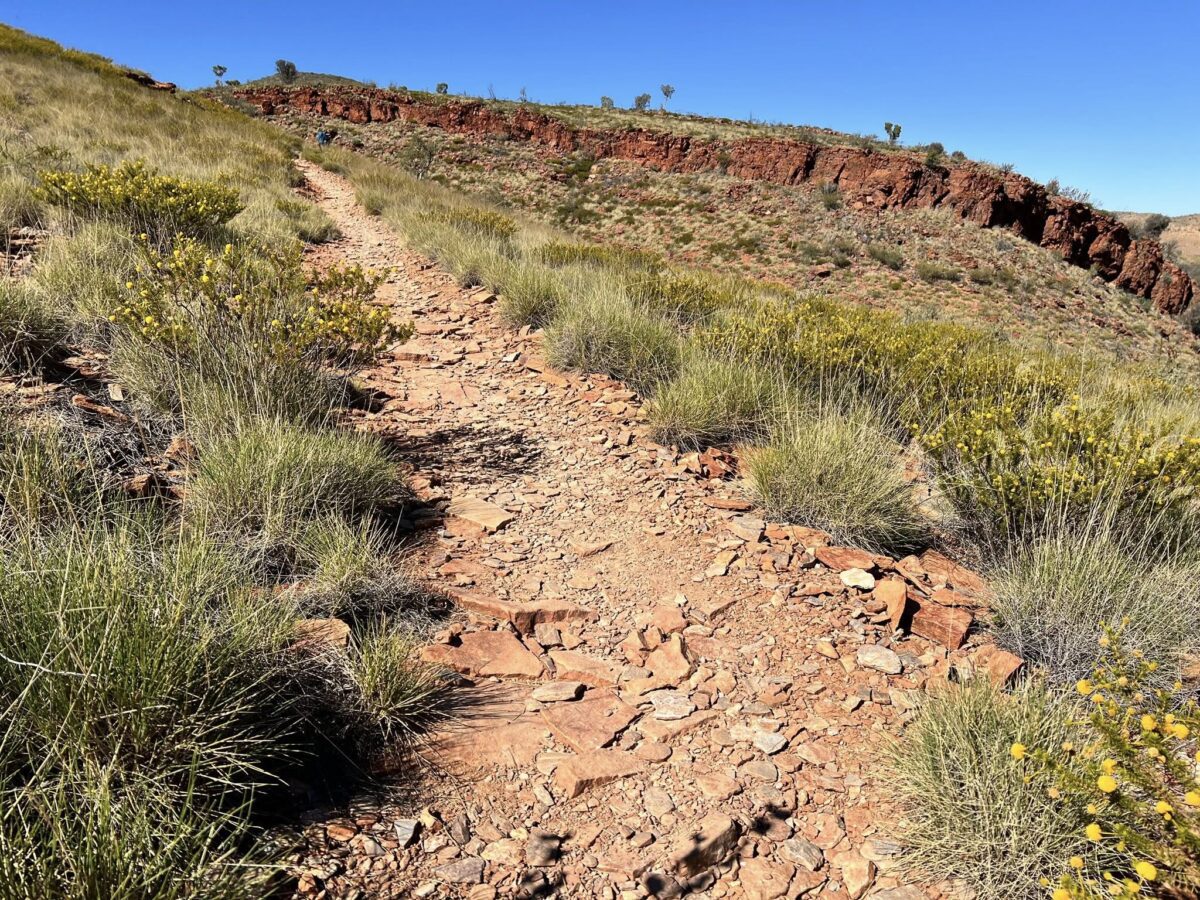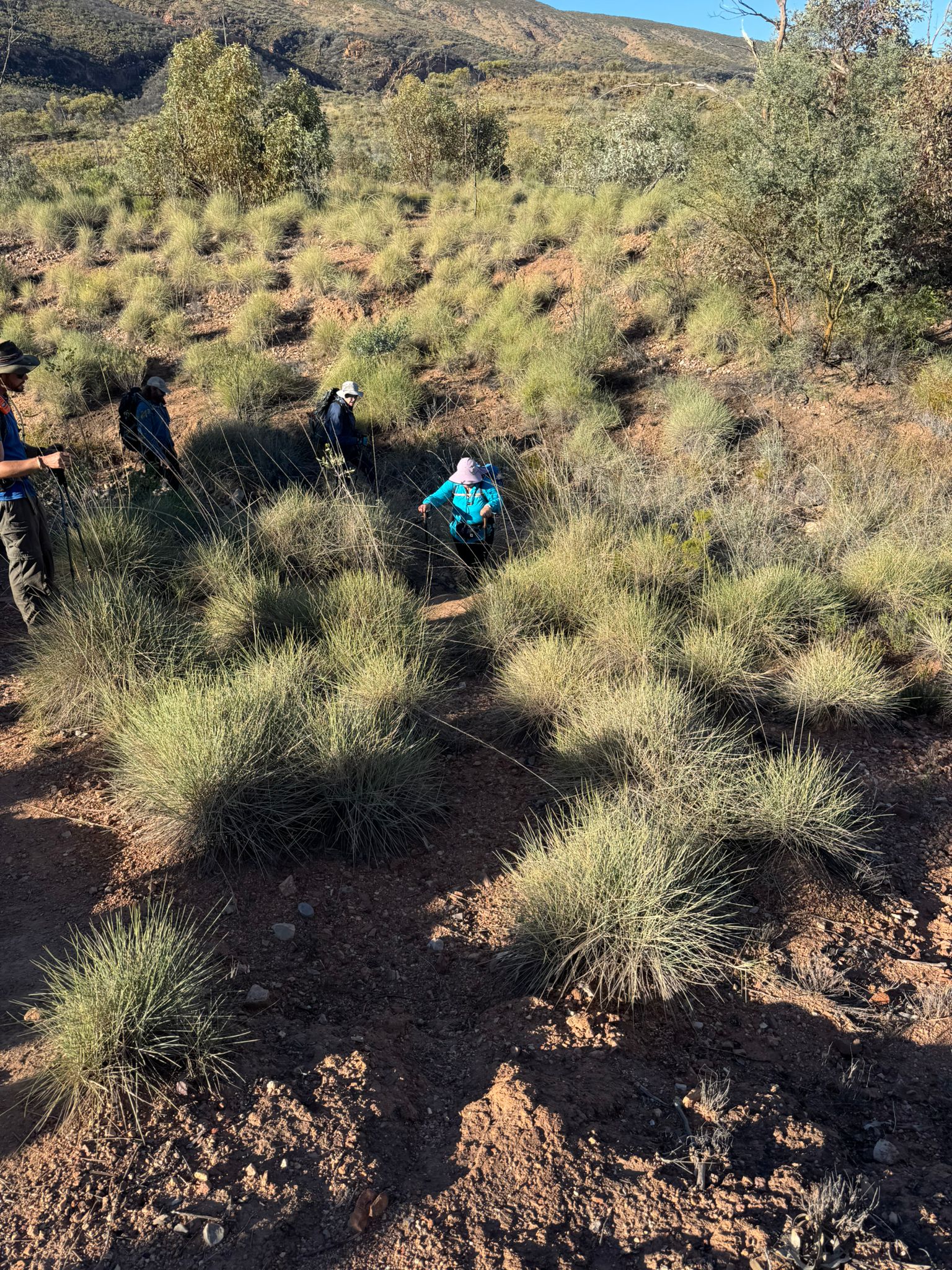 As we descend from the ridgetop to the base of the ridge we find ourselves hiking through the mulga trees, before following a track of dolomite limestone to our camp for another night of conversation and camaraderie under the stars.